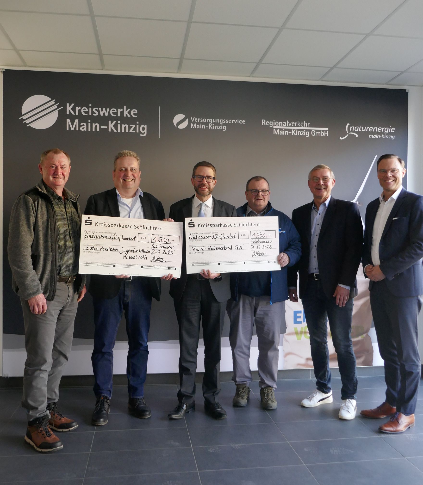 Die Kreiswerke Main-Kinzig engagieren sich auch in diesem Jahr zur Weihnachtszeit für gemeinnützige Projekte, die das soziale und ökologische Miteinander in der Region stärken. Die diesjährige Weihnachtsspende in Höhe von jeweils 1.500 Euro geht an den VdK-Kreisverband Gelnhausen für das Projekt „Aktivtisch“ sowie an das Erste Hessische Jugendwaldheim Hasselroth. Geschäftsführer Oliver Habekost überreichte gemeinsam mit Landrat Thorsten Stolz die symbolischen Spendenschecks an die Vertreterinnen und Vertreter beider Institutionen und nutzte die Gelegenheit zum persönlichen Austausch.