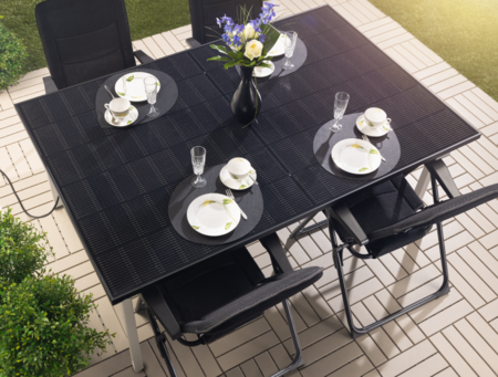 Hier hat das Solarmodul eine Doppelfunktion: Tagsüber wenn die Sonne scheint kann es (aufgerichtet) zur Stromerzeugung genutzt werden, abends dient das Modul dann als Tischplatte für gesellige Stunden im Garten. Damit ist es eine Alternative, wenn keine Möglichkeit besteht, Module am Balkon zu befestigen.